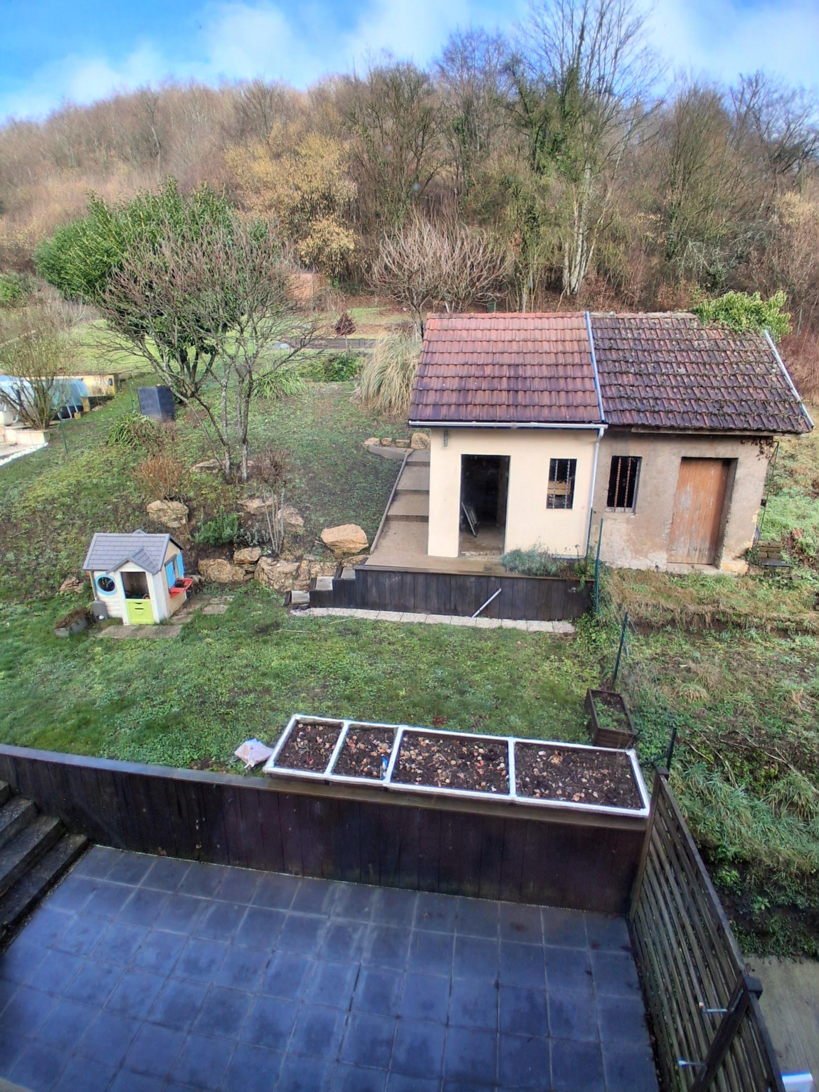 Cette maison est située sur l'avant de la parcelle, à l'arrière enviorn 4 ares de terrain arboré et entretenu avec abri de jardin , petit bassin et accès direct à la foret .